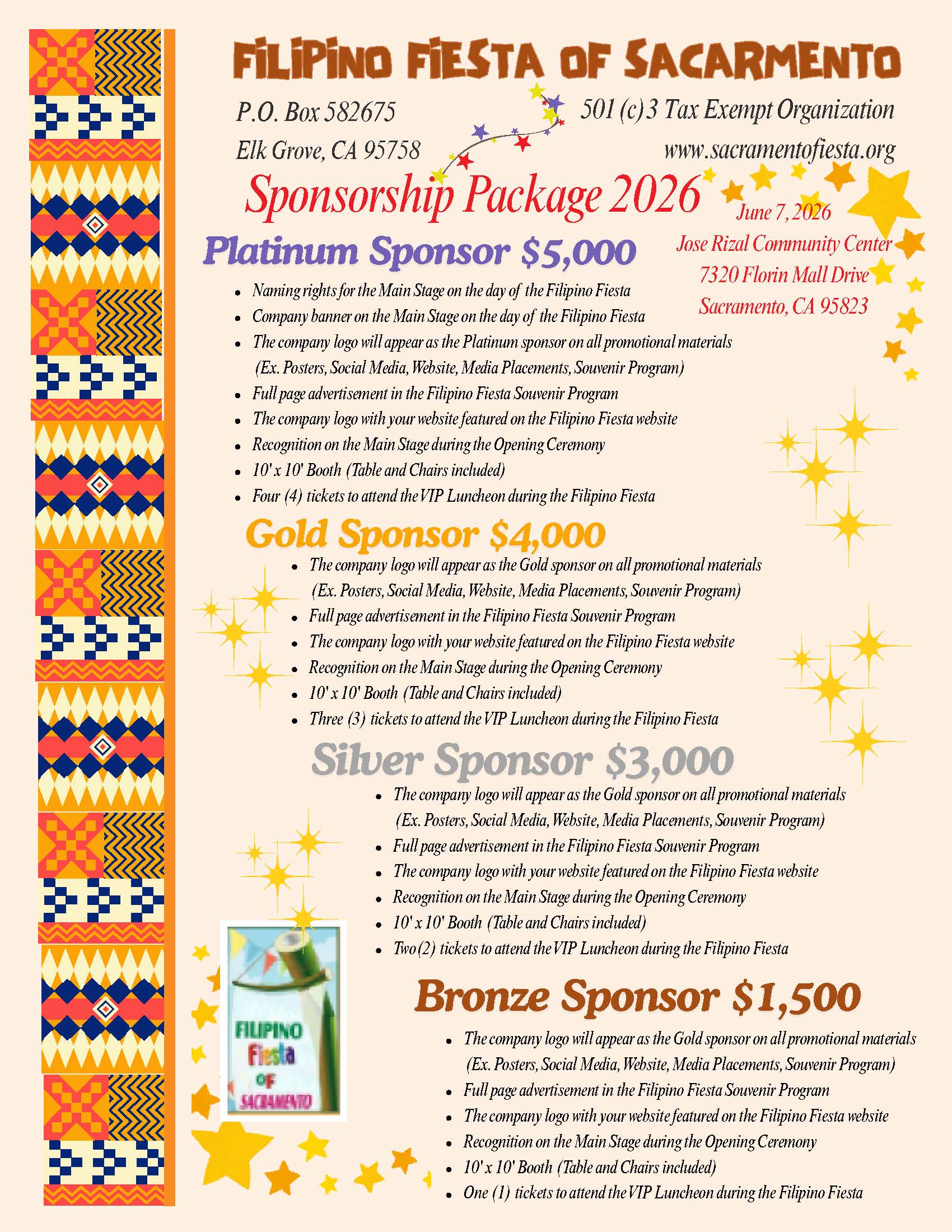 The Filipino Fiesta started in 1977 and has attracted around 10,000 people each event year for the last three years according to Sacramento Sheriff’s Department’s estimate. Each year there are over 60 businesses and community organizations participating as vendors. Guests packed the stage areas throughout the day to enjoy the performances of local entertainers. The celebration will take place at the Jose Rizal Community Center, 7320 Florin Mall Drive, Sacramento, California. It will start with our traditional parade that is joined by dignitaries, community leaders and all vendors, community organizations, and other groups. There will be food booths, a career fair, games, vendors, entertainment, a health fair, children’s activities, a historical display, financial consultants, and more. We are inviting companies, community-based organizations, the religious community, and other groups to participate in the activities as vendors, volunteers, corporate sponsors, etc. As a corporate sponsor, your company will receive valuable general and diverse market visibility. If you choose to be a platinum or gold sponsor you will receive additional exposure in our October event celebrating Filipino American History Month. For more information or to discuss your participation and/or sponsorship with an event professional please call: