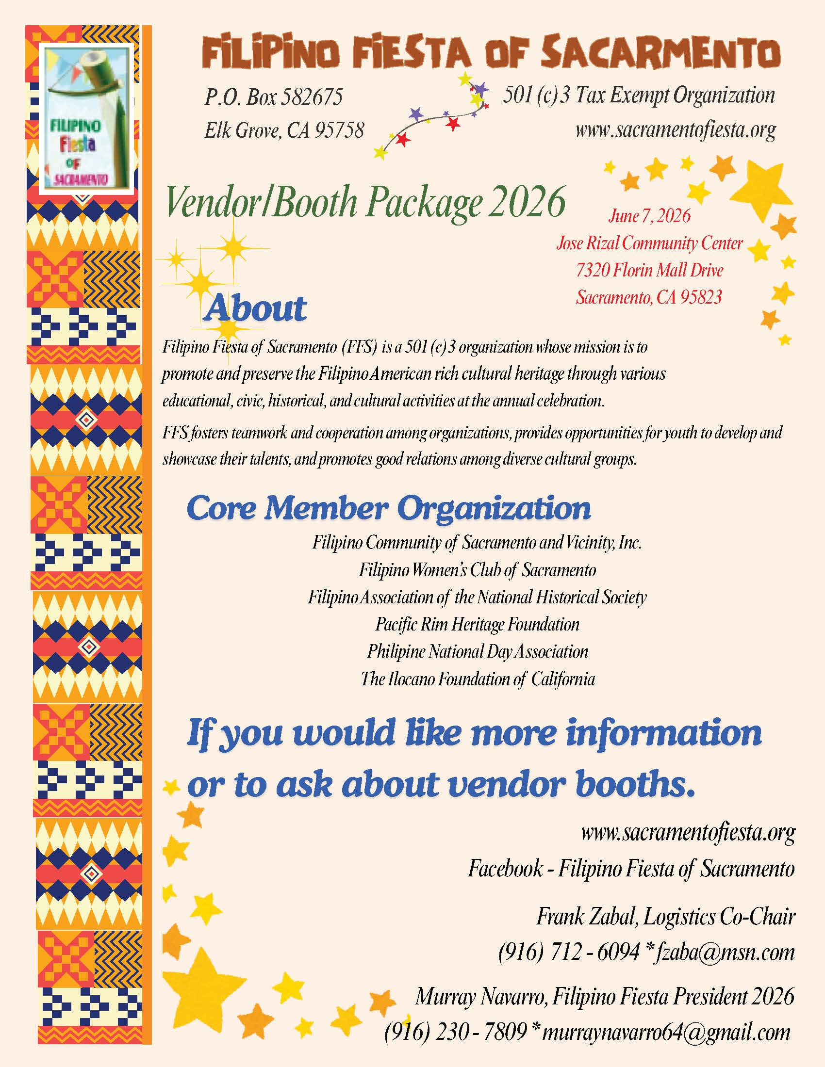 Questions & Concerns:Murray Navarro , 916.230-7809 or email sacramento.filipinofiesta@gmail.com